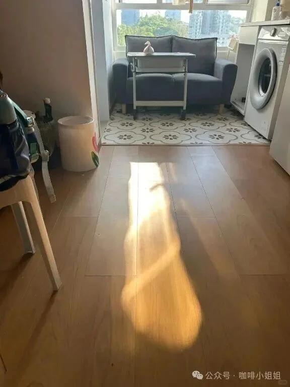 这个空间给我的感觉,不是压抑,是「紧」。紧和压抑不一样。紧是每一寸都被用上了,人在里头要转身都得想一下。但你看那道阳光,下午斜着打进来,落在木地板上,沙发就在窗边,绿树就在窗外。