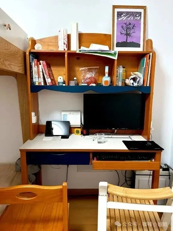 实木的,书架和桌面一体,上层放书、摆件,还有孩子画的画装了个框挂在最顶上。桌面有显示器、键盘,还有个打印机。两把椅子,一把实木的,一把折叠的。