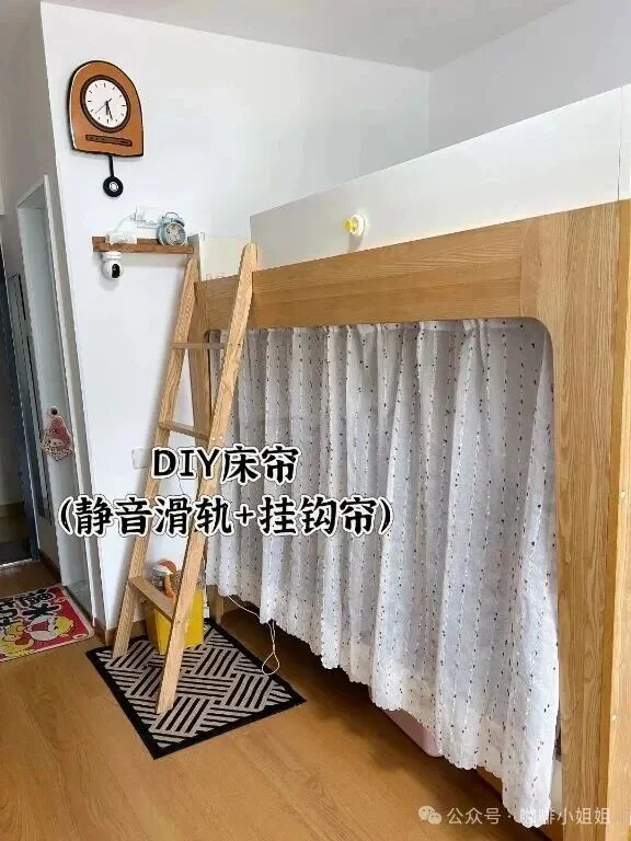 下铺自己装的床帘,静音滑轨加挂钩帘,这个细节做得很聪明