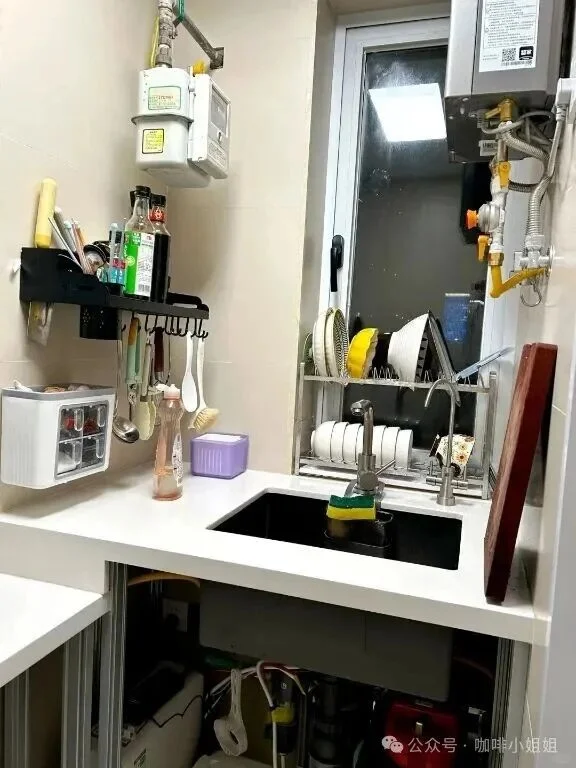 台面下方管线没有封,直接露着。有人说这样不好看。我觉得无所谓,又不是天天趴下去看。