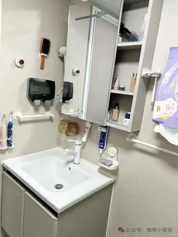 这个思路,放在任何面积的卫生间都管用。台面就是用来放当下在用的东西的,其他的全上墙,清爽,也好打扫。