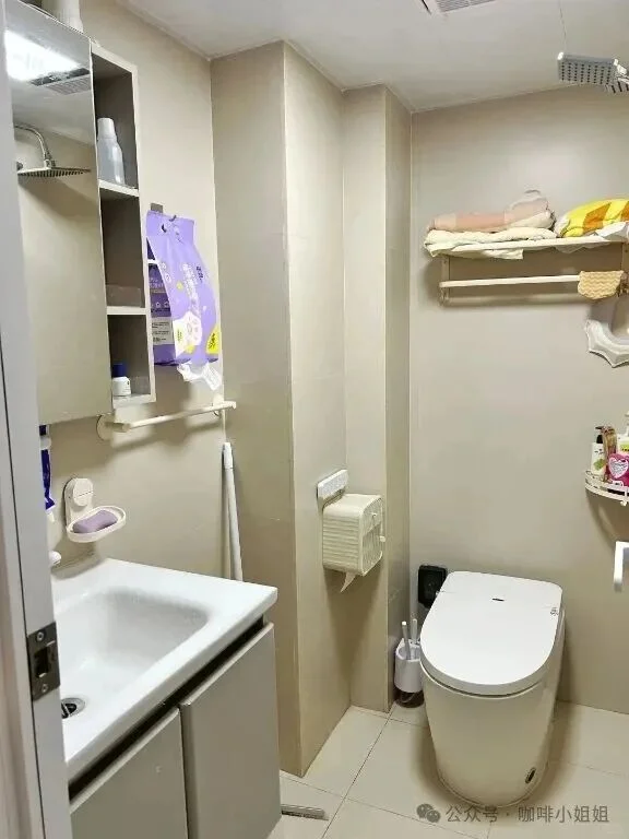 米色的墙砖,不抢眼,但也不显脏。智能马桶,这个配置在这个面积里算是舍得花钱的地方了。