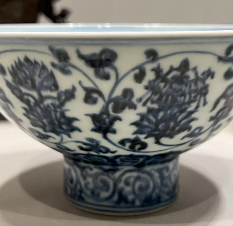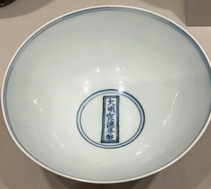 在画前驻足许久,我们继续前行至相连的小展厅。起初,这里陈列的瓶瓶罐罐引不起我们兴趣。正欲离开,忽然,一只青花碗映入眼帘——如此熟悉,令人驻足。那是一件明代宣德青花瓷碗,敞口圈足,外壁饰缠枝莲与“八吉祥”图案,碗底青花楷书“一行六字款:“大明宣德年制”(图4)。画工细腻,莲瓣翻转生动,青花色泽浓艳中隐含铁锈斑(图5),釉质温润如玉,造型端庄典雅,正是宣德官窑之典型风格。此碗静静伫立展台,宛如一位素雅的东方处子,含蓄静穆,自带风骨。它不事张扬,却神韵自生,令人肃然起敬。