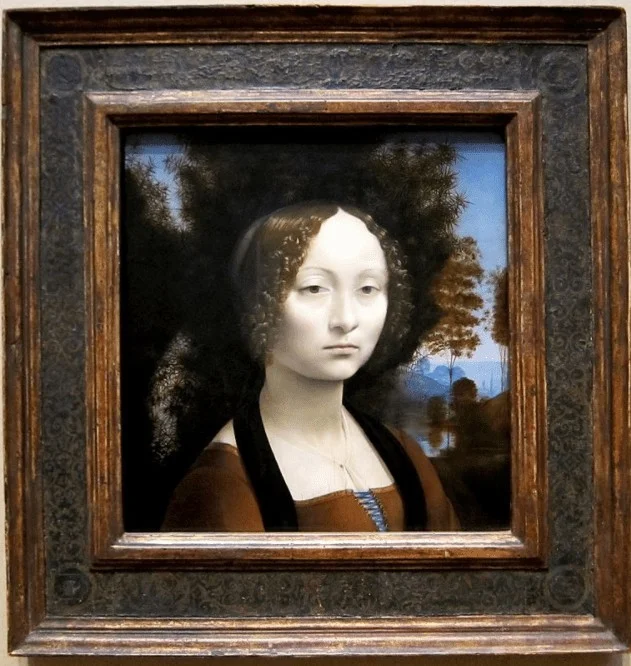 四月的北美,仍带几分早春的清寒,但我们到访之日阳光明媚,春意融融。美术馆外人头攒动,多是学生游客井然排队。步入展馆,首先映入眼帘的是达·芬奇在美洲的唯一真迹——《吉内芙拉·德·本奇》(Ginevra de’ Benci)肖像。这是一幅创作于1474年左右的双面肖像画,展现了达·芬奇早期的艺术探索与非凡天赋。吉内芙拉出身于佛罗伦萨名门,聪慧美丽,或许还曾是一位诗人,与当时文艺圈交往甚广。画作正面(图1)少女静坐于杜松丛前,面容苍白而凝重,目光平静却似透出若即若离的疏离感。这种隐含内心情绪的细腻表达,正是达·芬奇肖像的魅力所在。她金色卷发在阳光下熠熠生辉,令人过目难忘(图2);而背景树木、水影与天空则营造出人与自然合一的氛围。