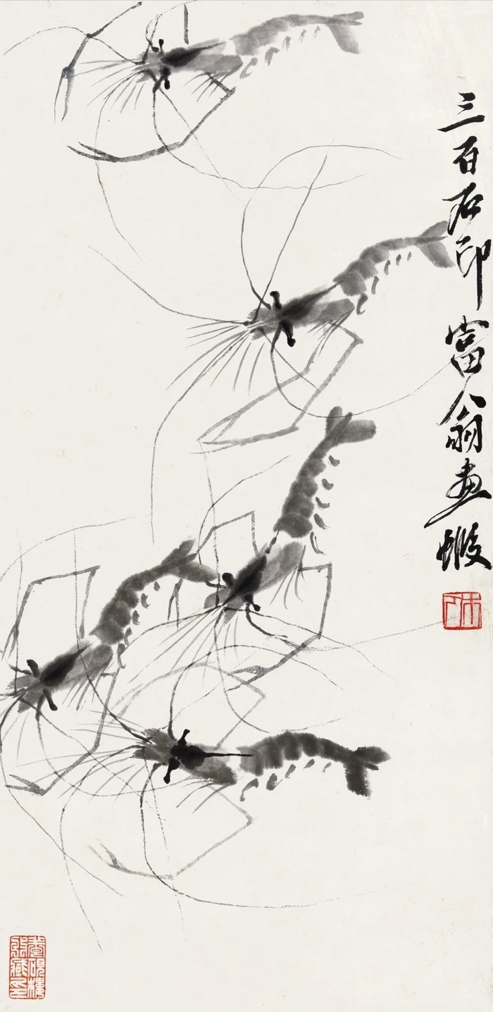到了近代,齐白石更是将“留白”推至化境。他笔下最为人称道的虾,画面中不着一滴水,却通过虾体的透明质感、长须的轻盈摆动,以及疏密有致的布局(即留白),让观者仿佛看见满纸清波,水意盈然。这正是“无画处皆成妙境”的典型体现。