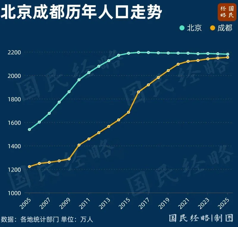 过去10多年来,北京人口一直稳定在2100万区间,而同期成都则从1685万大增到2100万以上。