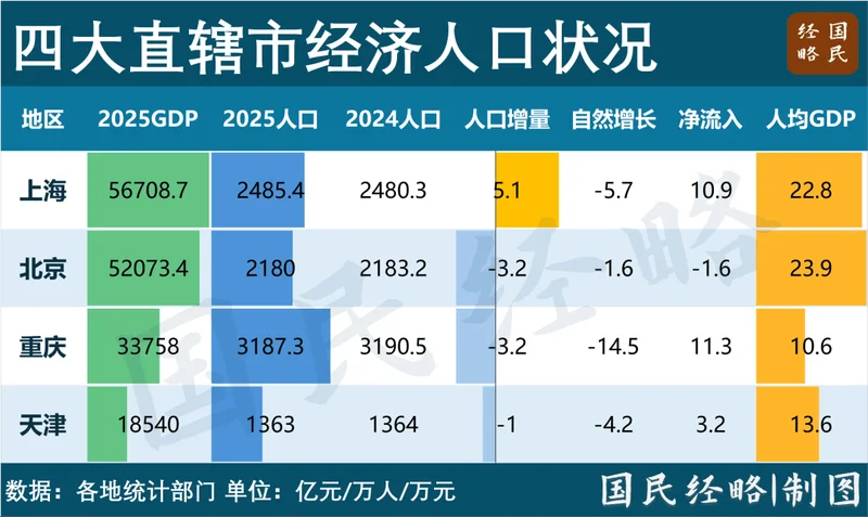 四大直辖市中,只有上海保持正增长,重庆减少3.2万人,为连续第三年负增长。
