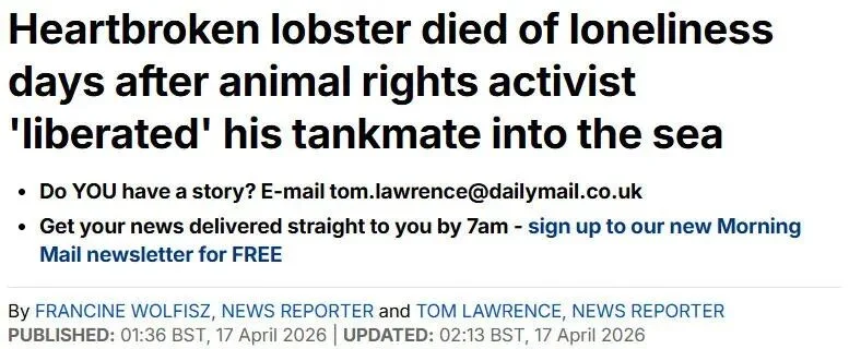 “整件事最让人痛心的是,那只龙虾大概一被扔进水里就死了。”