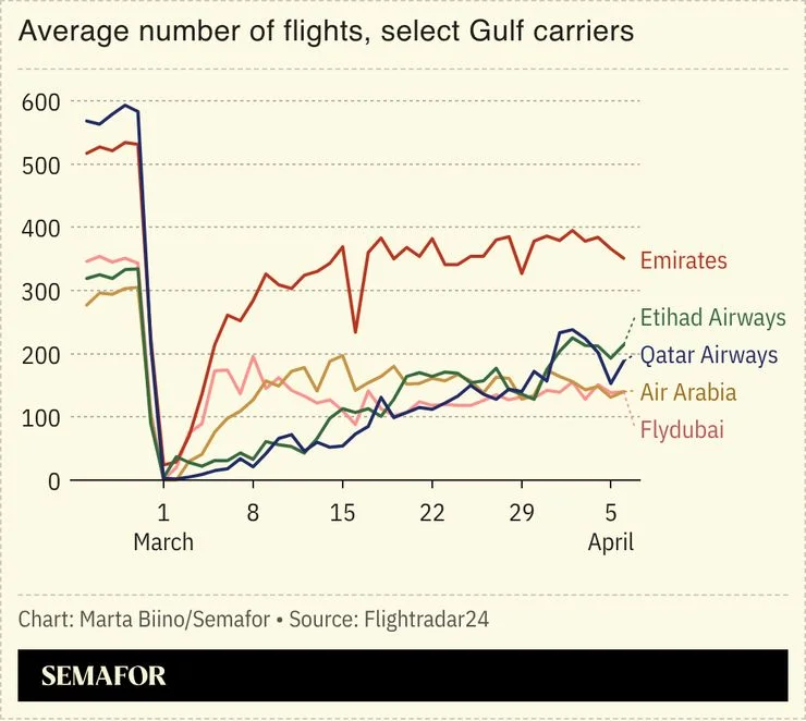 Flightrader24的数据显示,海湾地区主要航空公司的航班量3月1日出现断崖式下跌,近乎全面停摆;此后虽逐步恢复,但截至4月初,所有航司均未回到冲突前水平。正常情况下,迪拜、多哈、阿布扎比这三大机场每日合计处理超过3000架次航班。