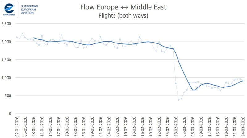 欧洲航空安全组织(Eurocontrol)发布的《欧洲航空趋势》报告显示,自3月5日起,中东地区相关航线航班量有所回升,每日双向约800班,较此前减少约1200班,降幅为59%。