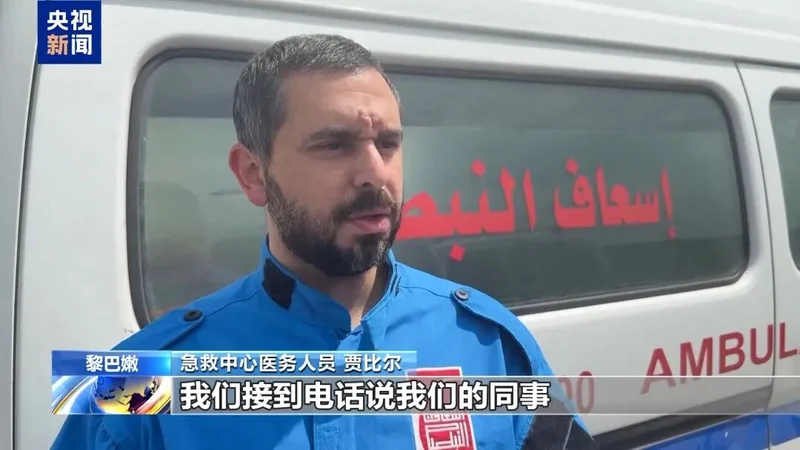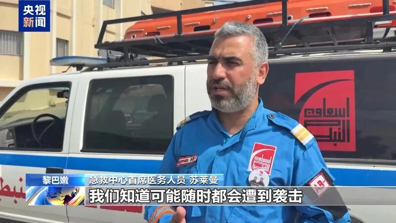 急救中心医务人员 贾比尔:我们接到电话说我们的同事,也是医务人员被以色列袭击击中,在他们之前已经有其他医务人员遇袭,于是我们去帮忙。这些人不仅仅是平民,他们也是我们的同事,所以我们情绪有些激动。我们赶到那里救助伤员,以色列可以看出我们是医务人员,他们袭击了两辆救护车并且继续瞄准平民和医务人员,再次袭击了我们。
