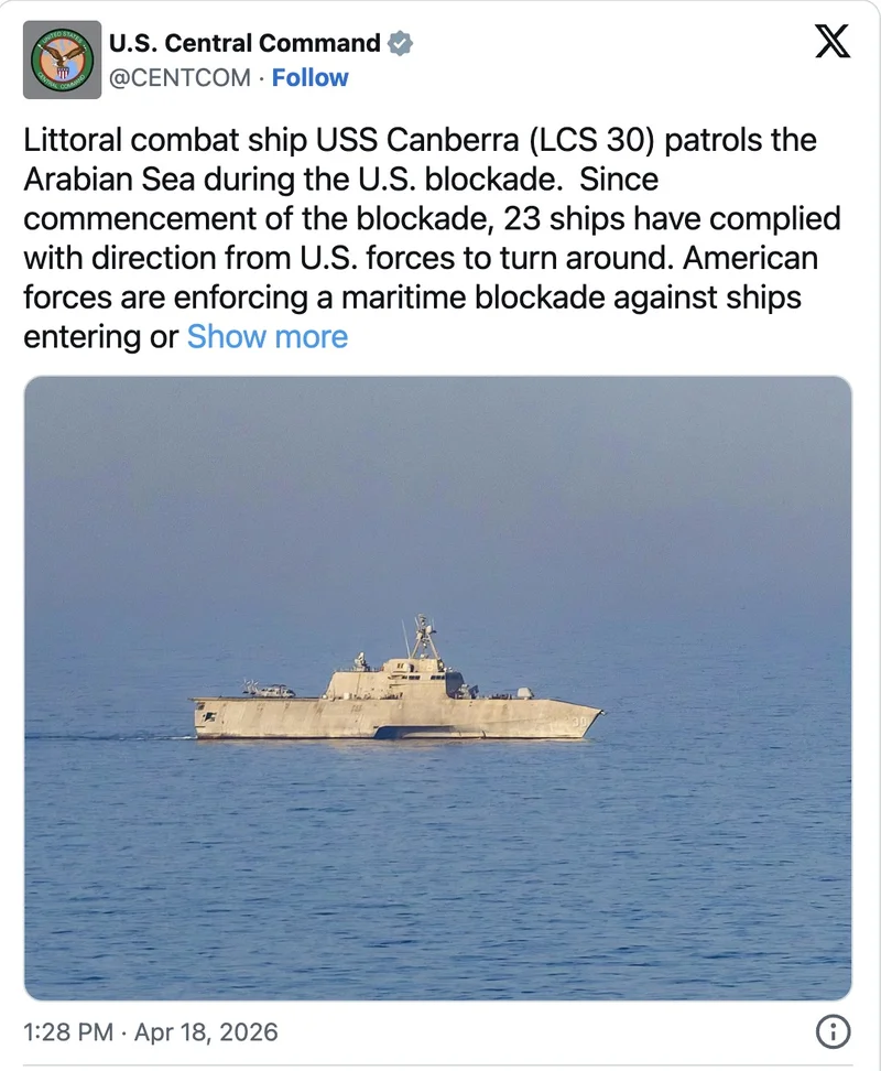 川普与白宫尚未对于霍尔木兹海峡重新遭封锁发布评论,不过,美军中央司令部稍早在X发文表示,美军正持续对进出伊朗港口和沿海地区的船只实施海上封锁,并声称自实施封锁迄今,已勒令23艘船只掉头。