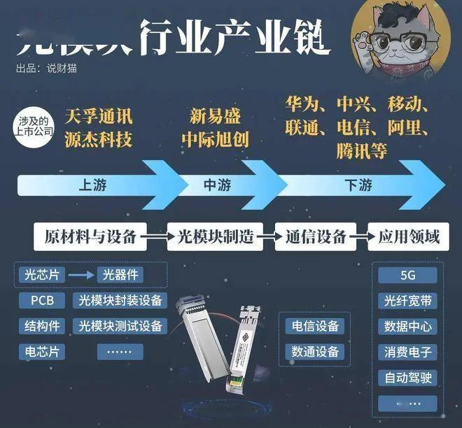 光模块的上游是原材料和设备,比如光芯片、光器件等,源杰科技、天孚通讯等就是干这些的;