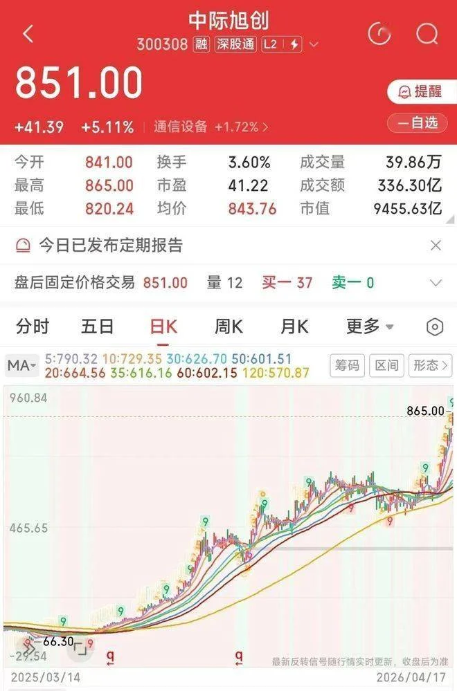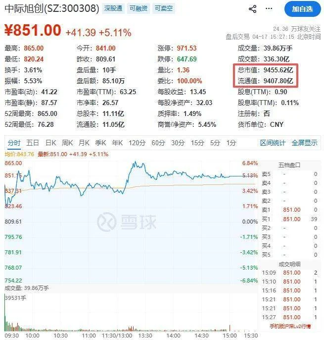 一年前,中际旭创股价还是66元左右,如今已经来到了851元/股。