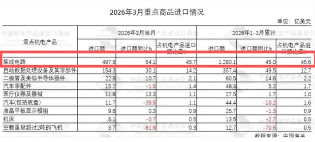 另外,我再给大家看看芯片进口的数据,2026年1-3月份,中国进口芯片的金额高达1280.1亿美元,同比增长了45.6%。