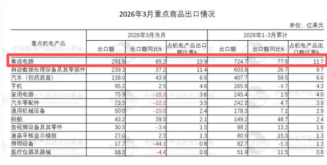 那就是3月份,中国芯片出口金额高达291.5亿美元,同比增长了85.2%,创下了历史纪录。而1-3月份,我们出口芯片高达724.7亿美元,同比增长了77.5%。