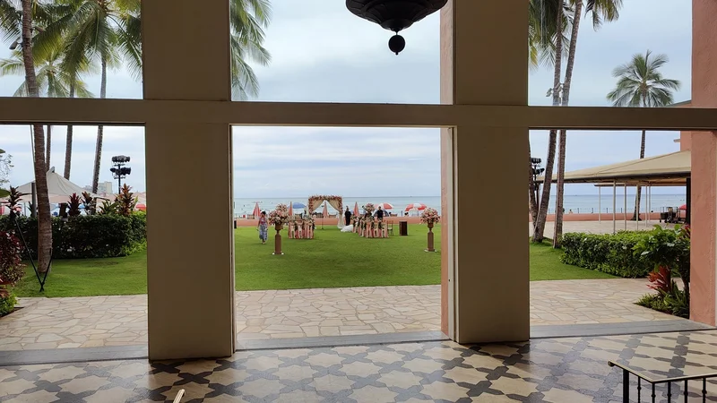 进了酒店大堂,再往里走,大长廊后面落地大玻璃窗果然就是Waikiki beach: