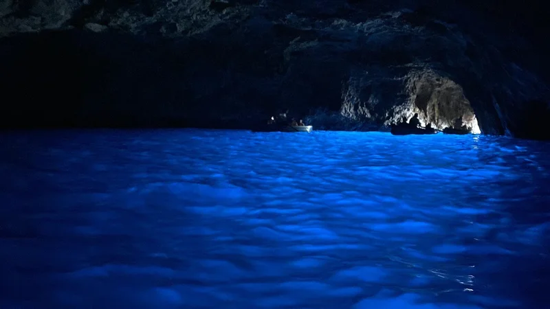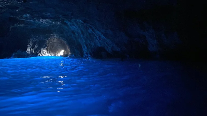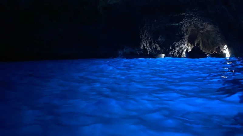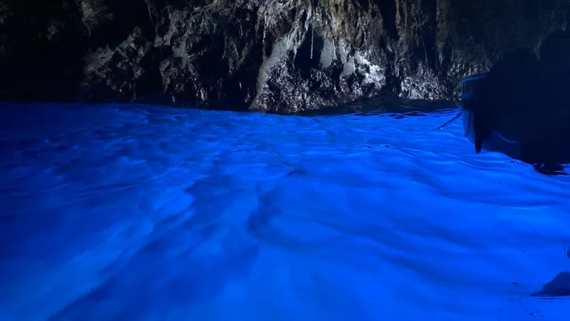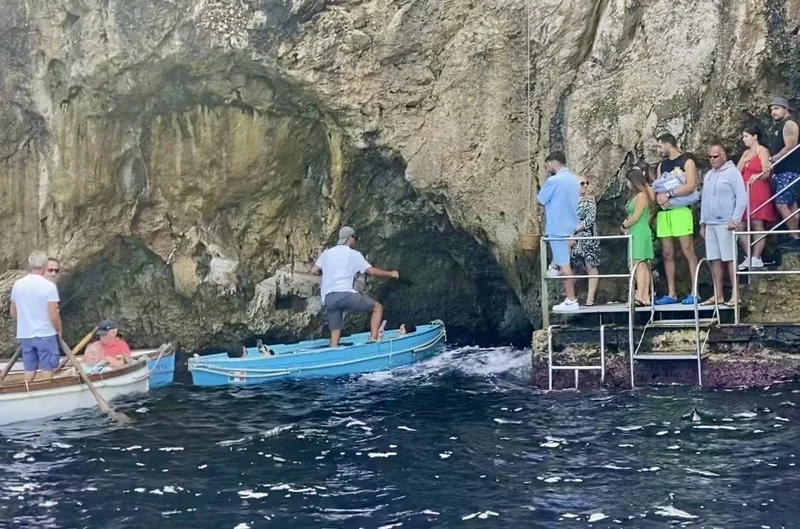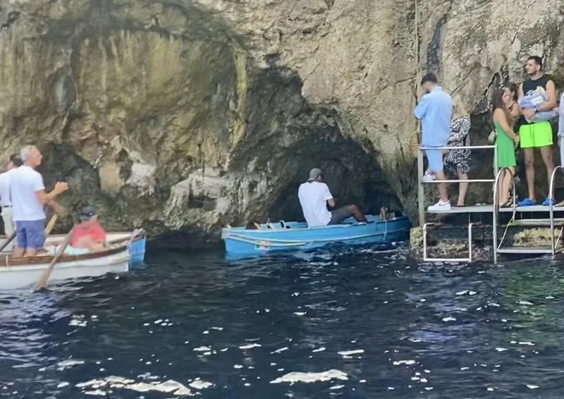 首先要去看看是 Blue Grotto(蓝窖)。一行10余人,换乘小快艇,劈浪向前,很快就来到洞口。再换乘小小舢板准备入洞。