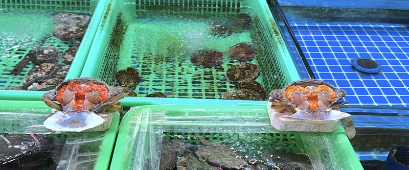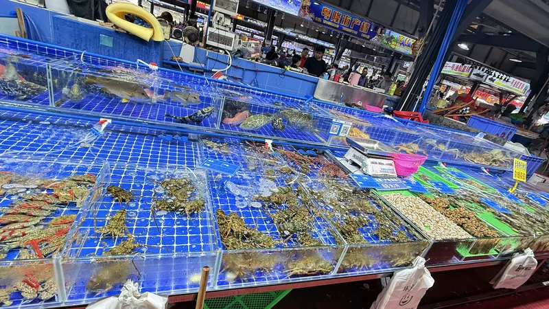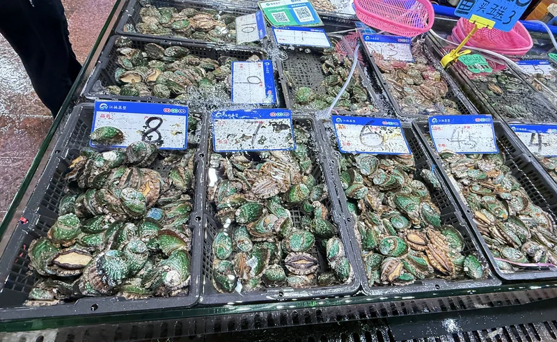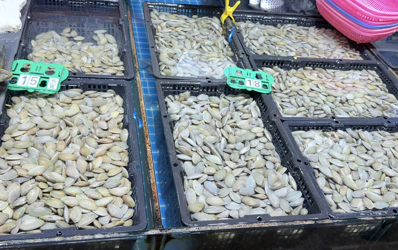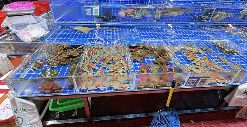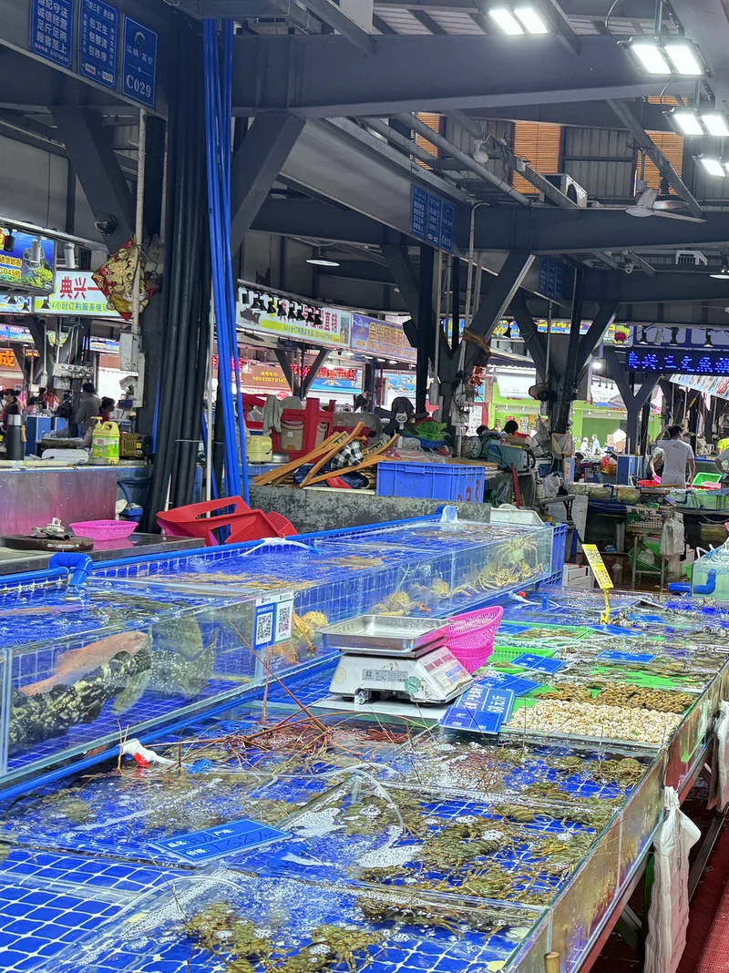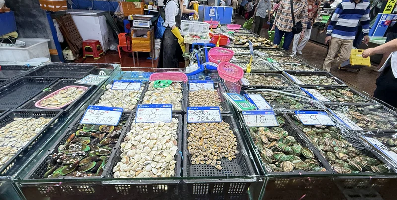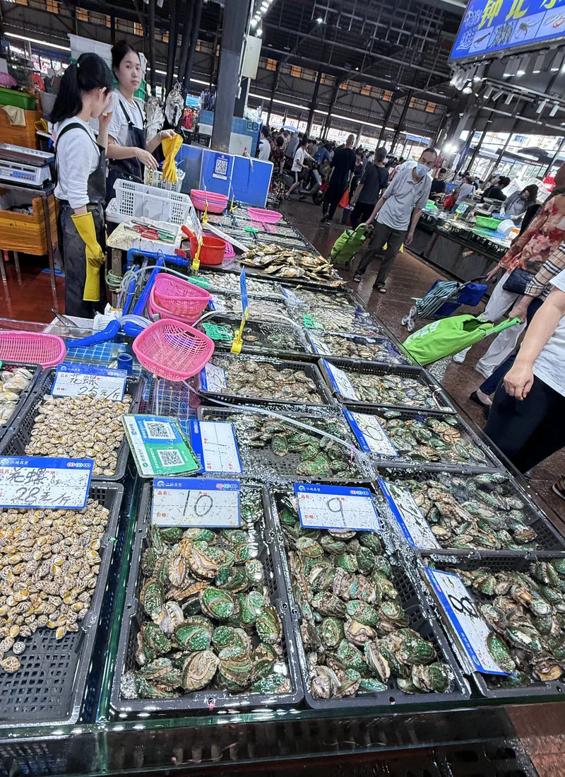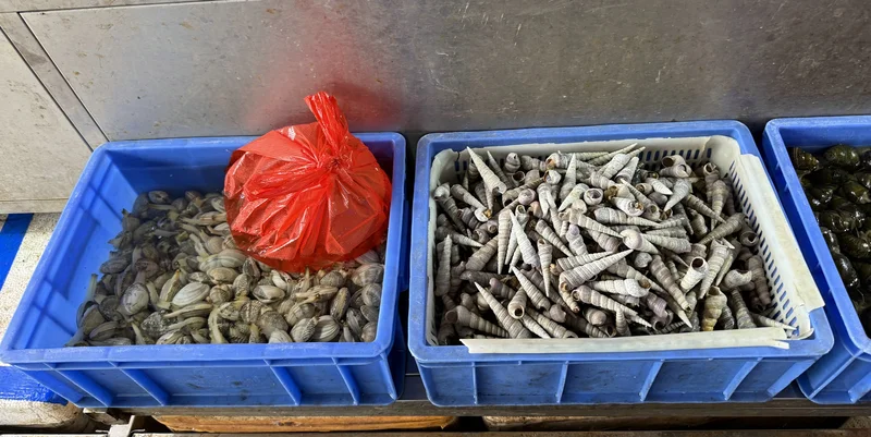 有贝壳类,如扇贝、白蛤、花蛤、钉螺、田螺等。可能走得急,没拍到卖墨鱼、章鱼的档口。