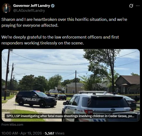 路易斯安那州州长Jeff Landry也发表声明称,对这起“可怕的事件”感到心碎,并感谢执法人员与急救人员的迅速反应。