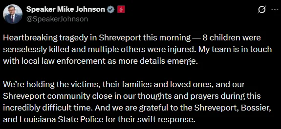 美国众议院议长、代表该地区多年的Mike Johnson则称事件“令人心碎”,并表示团队正与当地警方保持沟通。