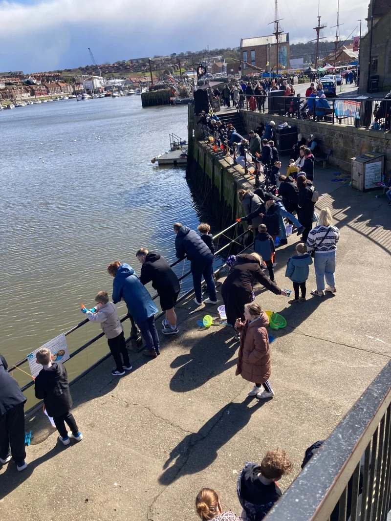 走到大桥的北端,向西侧的河岸上观看,看到这里始终聚集着许多人,他们或她们一个挨着一个地趴在河边的护栏上,身体前倾手里拿着一个线,聚精会神地眼睛盯着河面,每一组大多是爸爸或妈妈带着儿子女儿,或者爷爷奶奶带着孙子孙女,这是干啥的?
