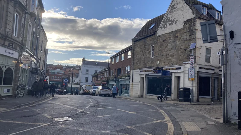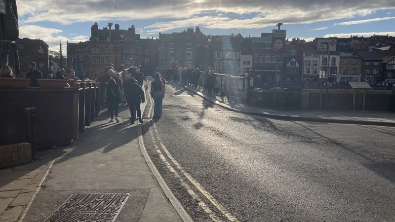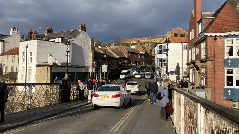 由于惠特比小镇地跨Esk河口的两岸,两岸之间的交通就成了一个重要考虑。在镇中,只有一座跨河的桥。下图是从修道院遗址沿着199级台阶走下去之后,走过一条步行街(各位看图片右侧这座建筑的房角处的交通禁行牌,那就是步行街的出口),图中 正对面这条路就是通向这座桥的道路,远处可见在桥头管制交通的红绿灯。