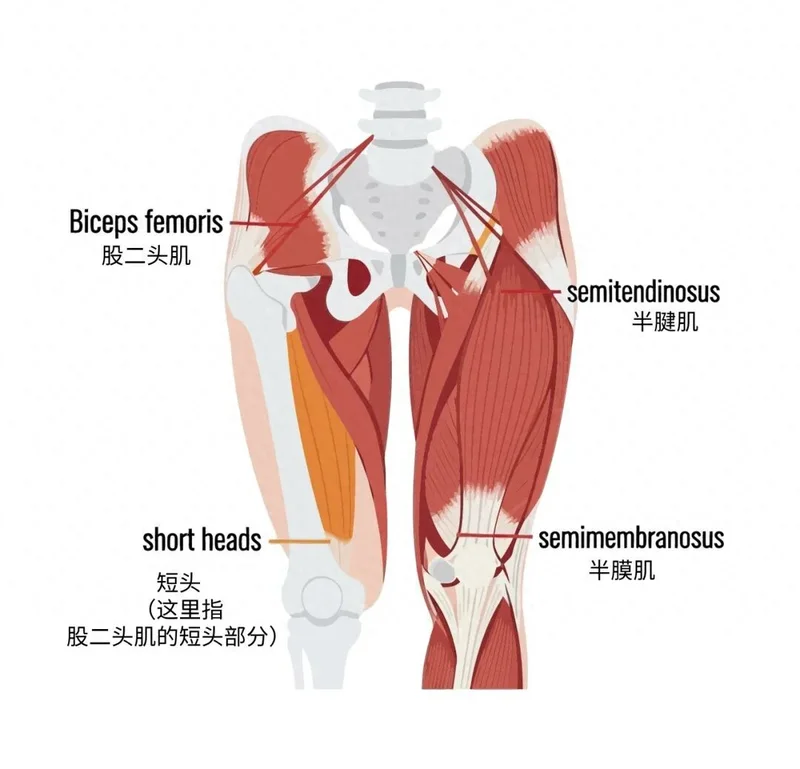 腘绳肌其实不是一块肌肉,而是一组肌群的统称,位于大腿后侧,由三块肌肉组成:半腱肌、半膜肌和股二头肌。
