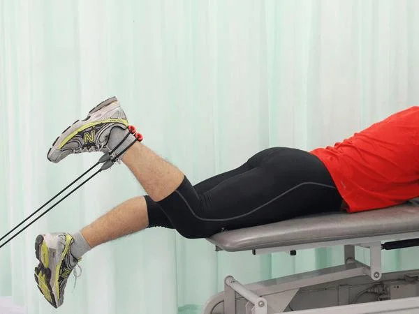 俯卧在瑜伽垫上,双腿自然伸直,脚尖绷直;双臂可自然放于身体两侧,或双手交叉垫在额头下方,保持上半身稳定不晃动。取一根弹力带,将一端固定在身前的稳定物体上(比如床腿、训练架、沉重的家具腿),固定高度与脚踝平齐或略低;然后将弹力带的另一端套在单侧脚踝上方。注意,弹力带需要处于轻微绷紧的状态。