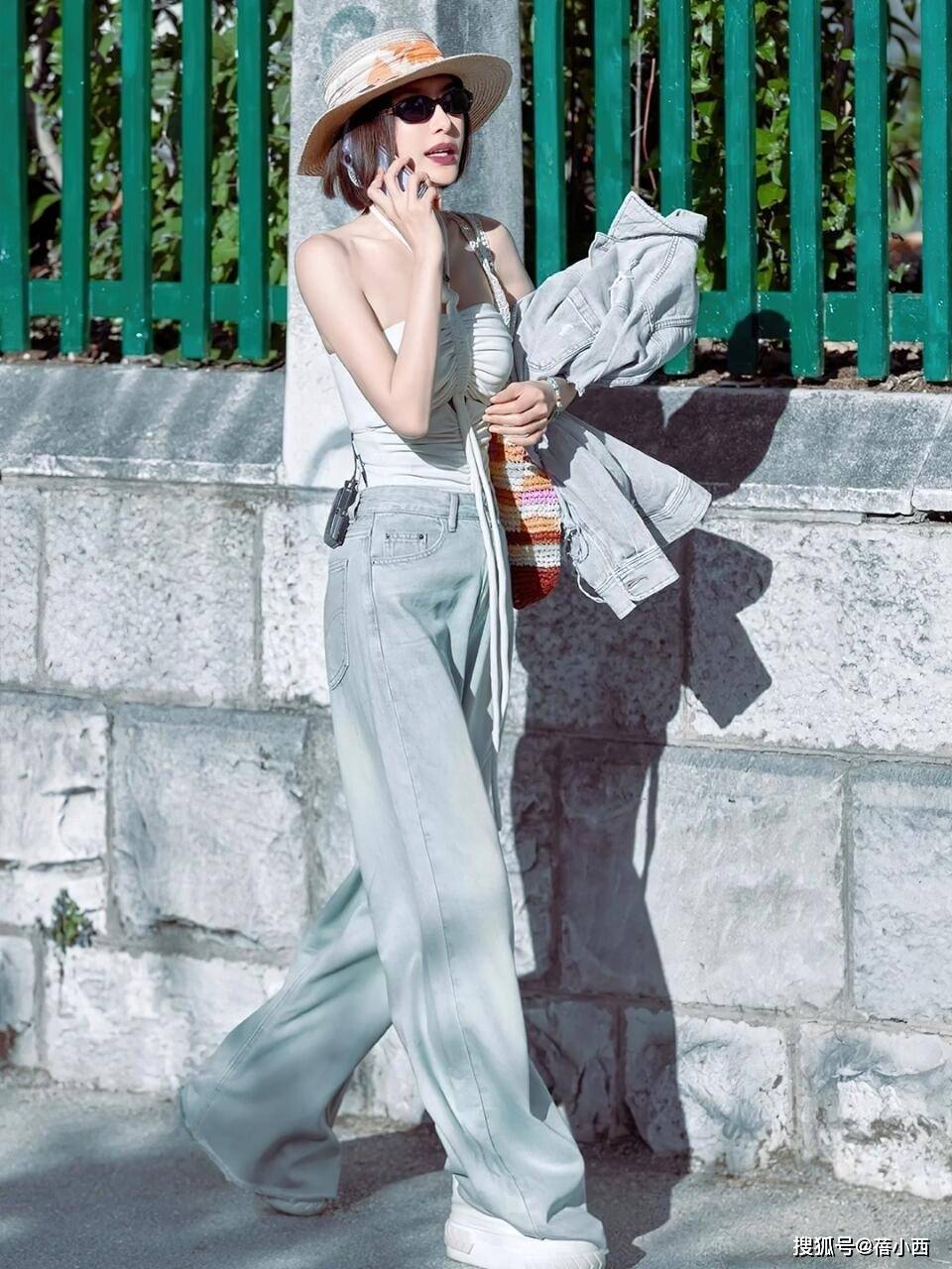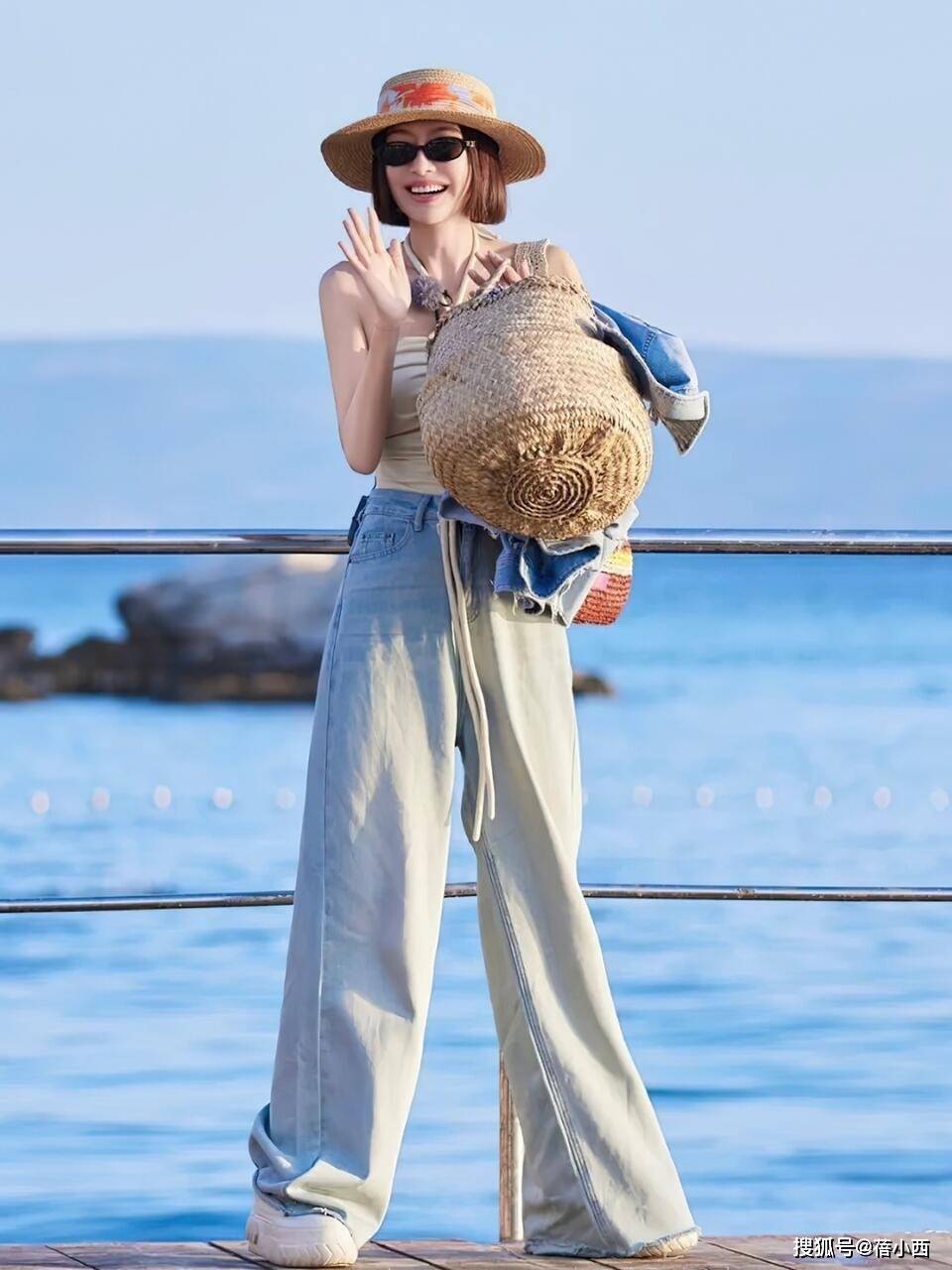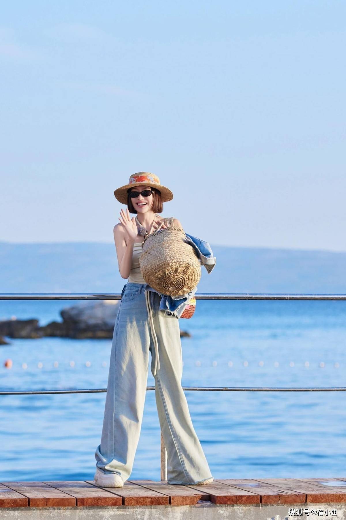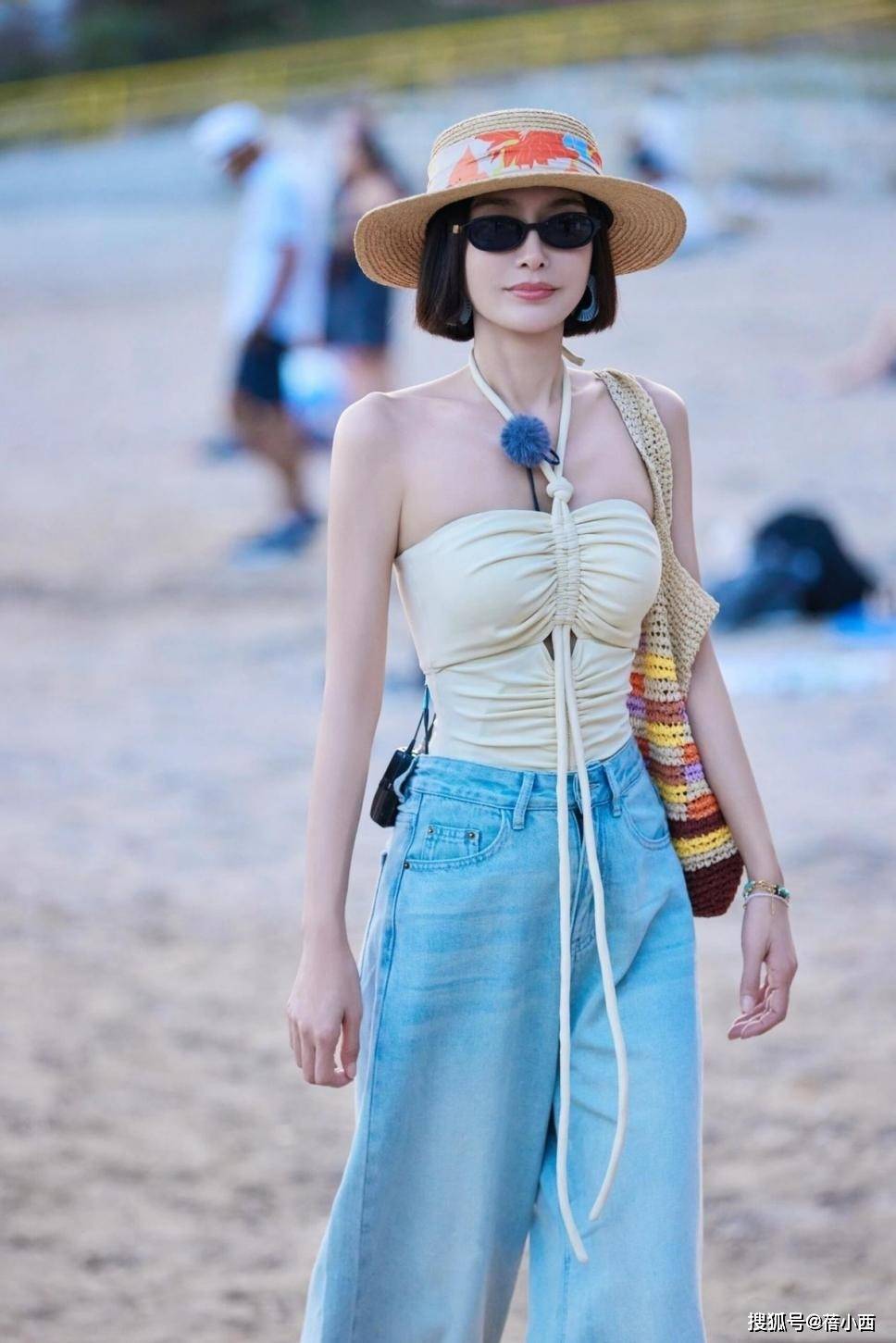 配饰的选择也很用心,草编宽檐帽、墨镜和编织包,都是加分项,刚好呼应了整体的休闲氛围,帽子上的彩色印花和包袋的编织质感,也给简约的搭配添了几分细节,不会显得单调,再看她的发型,微卷的短发利落清爽,和整体造型的松弛感相得益彰,没有刻意扮嫩,却透着自然的活力。
