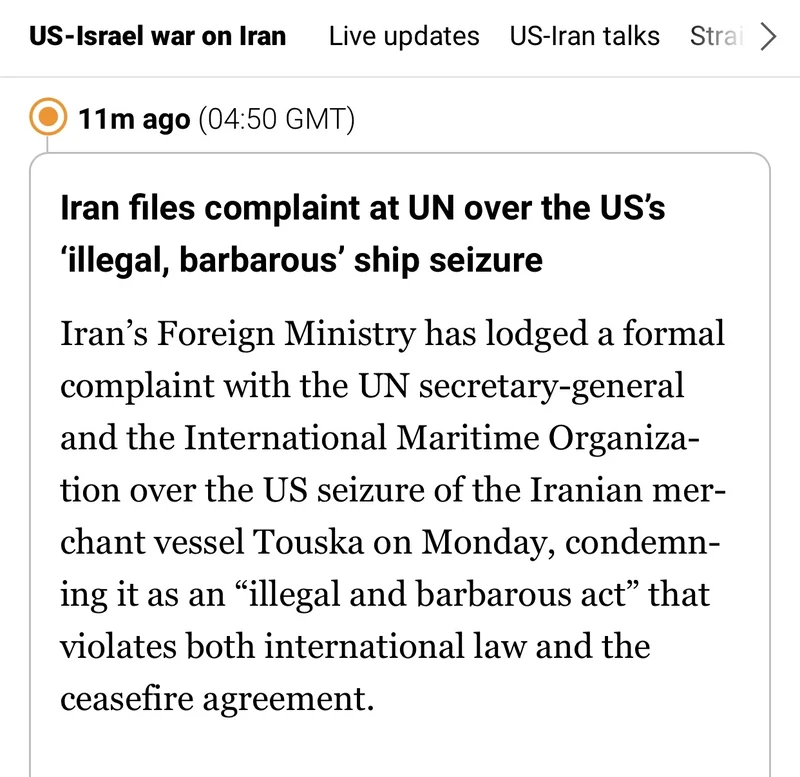 卡塔尔半岛电视台官网4月21日报道:伊朗外交部周一就美国扣押伊朗商船「图斯卡」号(Touska),向联合国秘书长和国际海事组织提出正式投诉,谴责这是违反国际法和停火协议的“非法和野蛮行为”( as an “illegal and barbarous act”)。