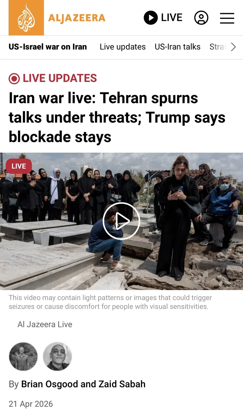 当地时间4月21日晚,伊朗外长阿拉格奇在社交平台表示,美国封锁伊朗港口是一种战争行为,因此违反了停火协议。袭击一艘商船并劫持其船员是更严重的违反行为。阿拉格齐还表示,伊朗非常清楚如何应对限制,如何捍卫自身利益,以及如何抵抗霸凌行为。(总台记者 李健南 王政)