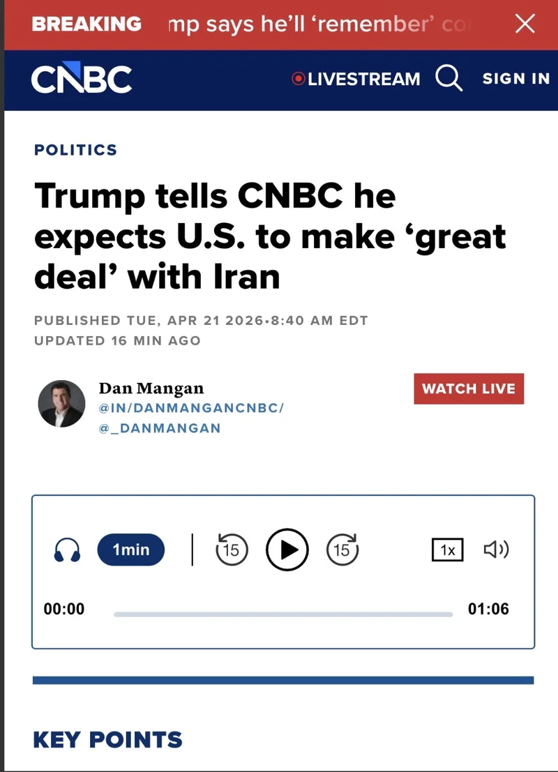 美国消费者新闻与商业频道(CNBC)官网4月21日报道:周二,特朗普总统在被问及”预计与伊朗的第二轮和平谈判会取得什么成果”问题时表示,他认为,美国“最终会与伊朗达成一项重大协议”(the U.S. is “going to end up with a great deal” with Iran),以结束长达数周的战争,尽管他表示,由于停火协议会在周三到期,他不打算延长停火。“我认为他们已别无选择”。