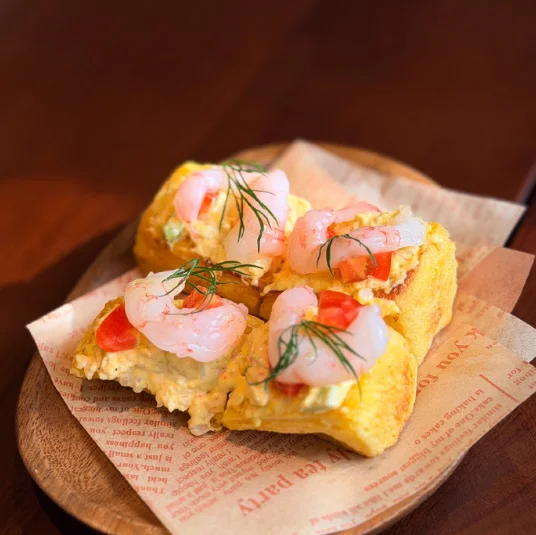 单人套餐包含四块红虾塔塔吐司、五种关东煮和青花鱼釜饭。