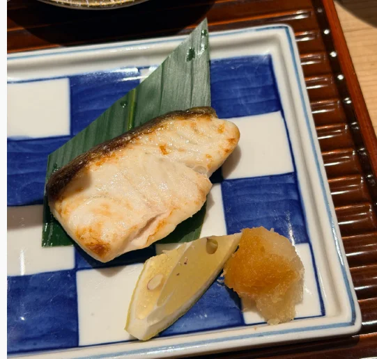 有8贯寿司、烤鱼、茶碗蒸、醋渍章鱼、海鲜味增汤,还有甜品。
