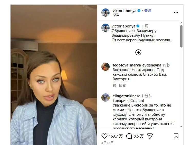 4月14日,博尼亚在Instagram上发布了一段约19分钟的视频,向普京谏言。她称,这段视频是“代表人民”与普京的对话,而她决定公开讲话,是因为普通民众和总统之间存在着一道“巨大而厚重的墙”。
