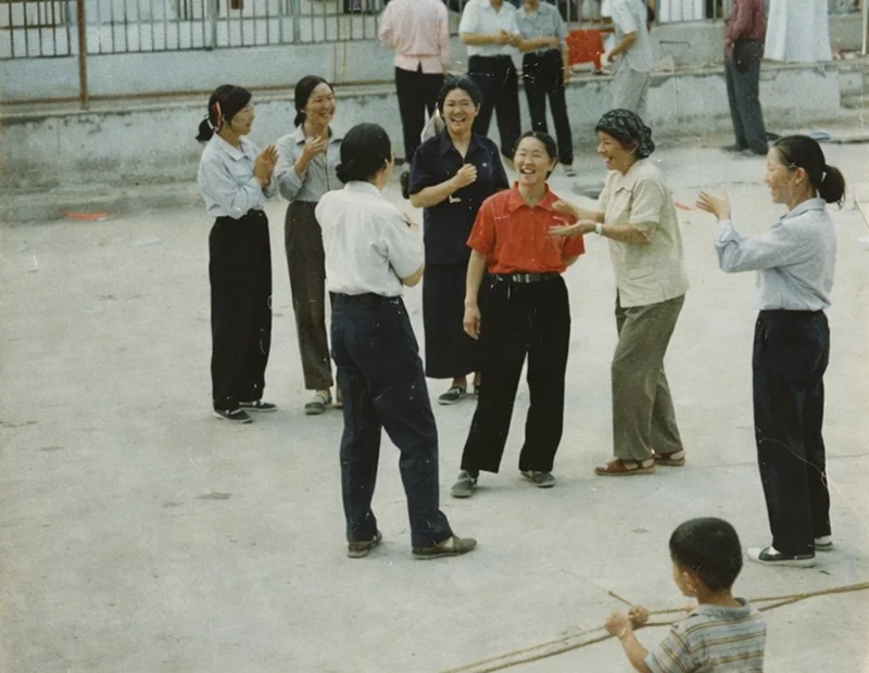 几位嫂子坐在水泥台上,手里没茶也能聊半天。有人笑得前仰后合,有人眯着眼听,偶尔抬头看看晾衣绳上的衣服。孩子在旁边跳皮筋,男人们路过打个招呼。那时候的幸福很简单,有院、有邻、有话题。照片边角磨白了,可那份热闹还在。