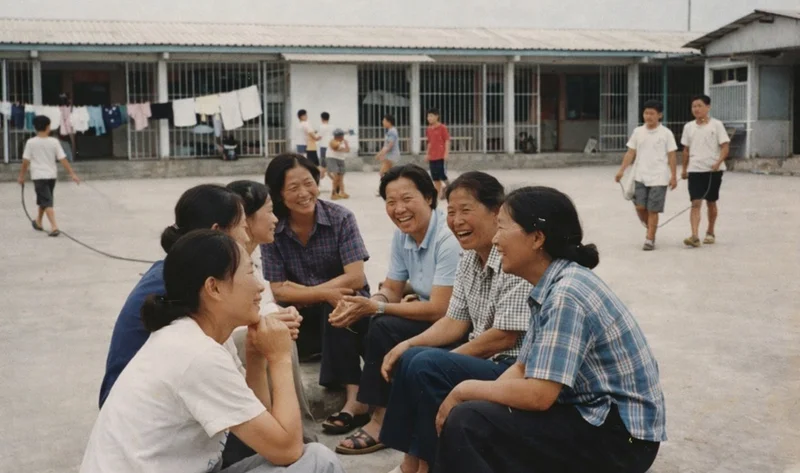 大院的女人们围成一圈唠家常,笑声能传到伙堂门口。有人说她们是“军嫂八卦局”,其实不过是聊孩子、聊菜价、聊谁家电话打不通。前头俩小子玩跳绳,绳子打在地上啪啪响,像给这场闲聊打节拍。阳光不刺眼,空气里有肥皂味儿和饭菜香,那就是九十年代的味儿。