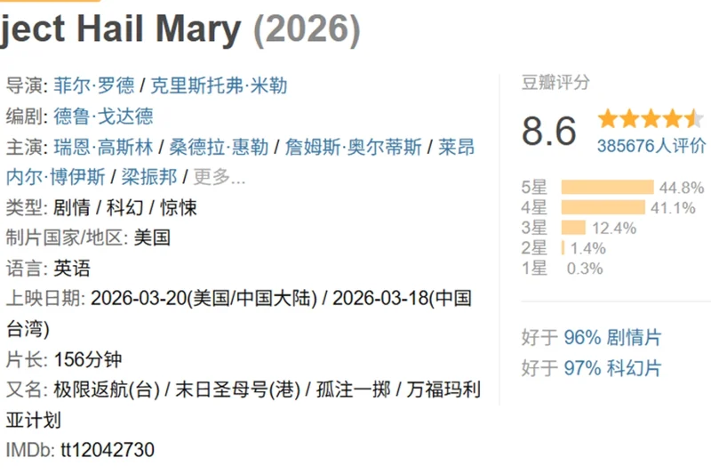 这部电影可以说是2026口碑最棒的院线片了,烂番茄达到95%,豆瓣评分8.5,全球票房5.73亿,然而国内首日票房仅900万。