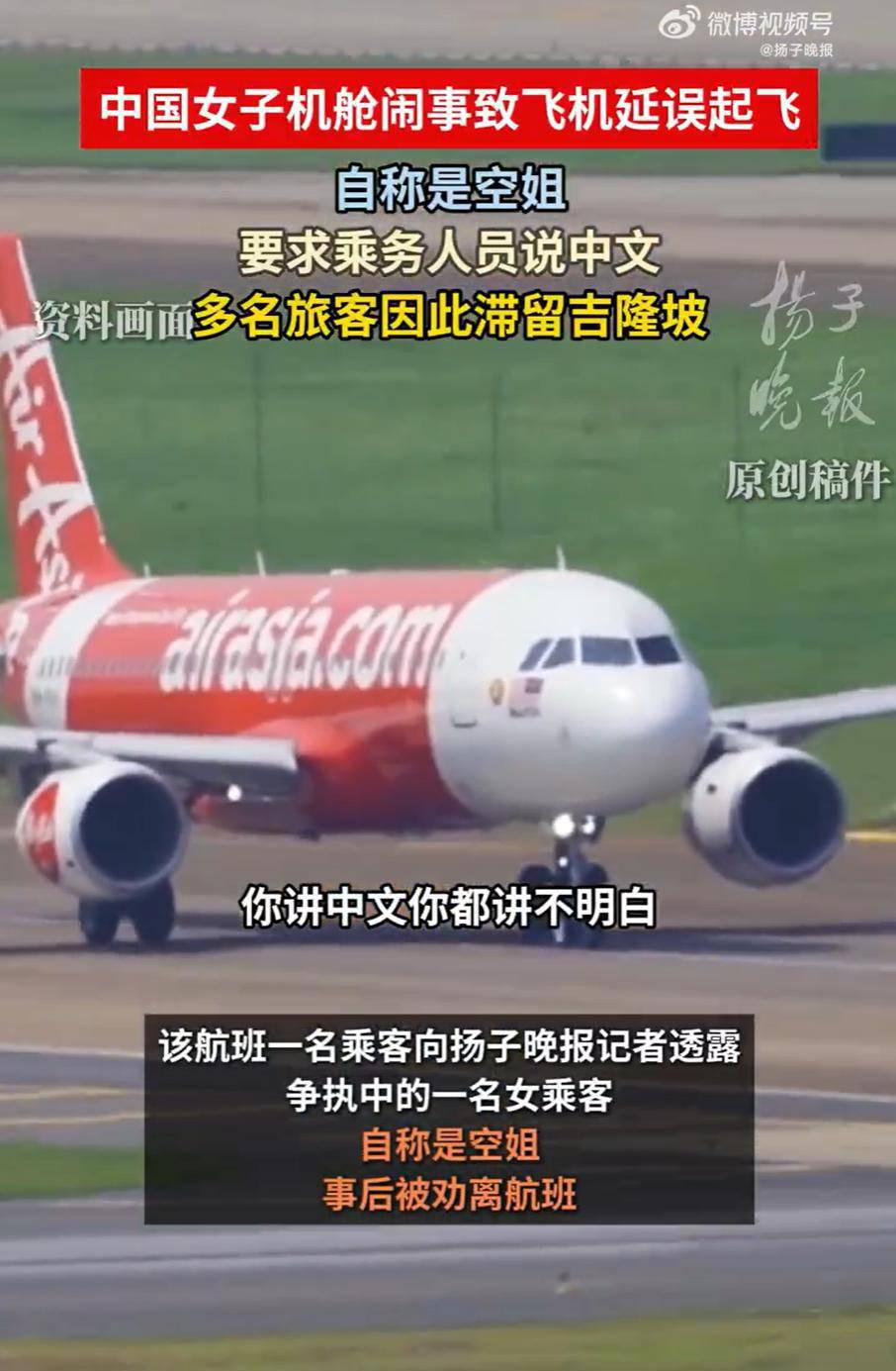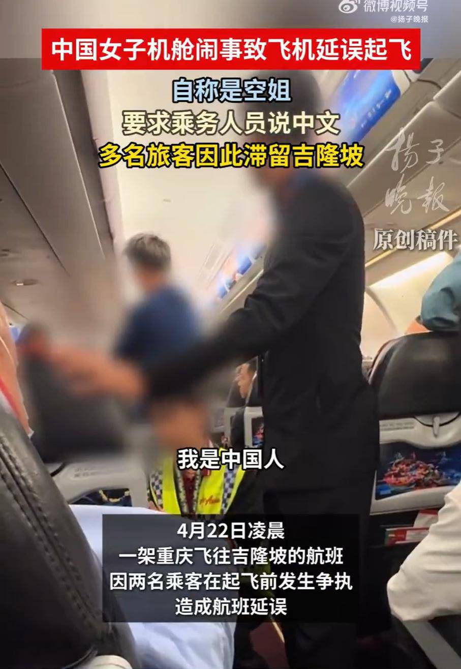 4月22日凌晨,有网友曝出,亚洲航空一架从重庆飞往吉隆坡的航班上,一名女乘客与邻座乘客及空乘发生激烈争执,并导致航班延误。据目击者称,飞机滑行时,该女子仍在机舱内大声通话,邻座一位马来西亚籍乘客出言提醒,被该女子拒绝。随后,马来西亚乘客拍下该女子的照片,双方矛盾迅速升级。亚航空乘到场协调处置时,该女子当场大怒,质问空乘,“不会中文,飞什么国际航班?”据悉,涉事航班为马来西亚亚洲航空公司D7809,因此事延误1小时29分,警方到场将这名中国女乘客带下飞机进一步协商。(据4月23日大皖新闻)