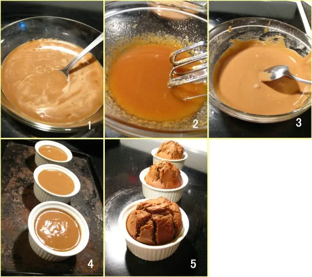 五、将面糊倒入3个直径3.5英寸深1.5英寸的陶瓷模里(用其它模子完全可以,应根据模子的大小来调整时间罢了)。放入预热的烤箱,350F,15-18分钟。