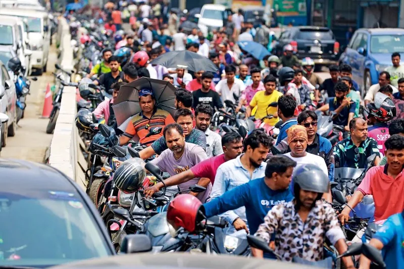 4月18日,孟加拉国首都达卡,在加油站外排队等待加油的人群。图/视觉中国