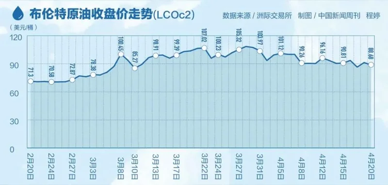 原油期货价格反映了市场对于未来的预期,2月28日以来,其经常随着人们对战争结束乐观或悲观的预期而暴涨暴跌。4月17日,伊朗方面曾表示,鉴于黎巴嫩和以色列达成停火,伊朗对所有商船开放霍尔木兹海峡,随即引发国际油价跳水,回落至每桶90美元以下。尽管布伦特原油现货价格当天也有所回落,但是每桶仍比6月交割的期货价格高出约30美元,而在正常情况下,这一价差只有1至2美元。