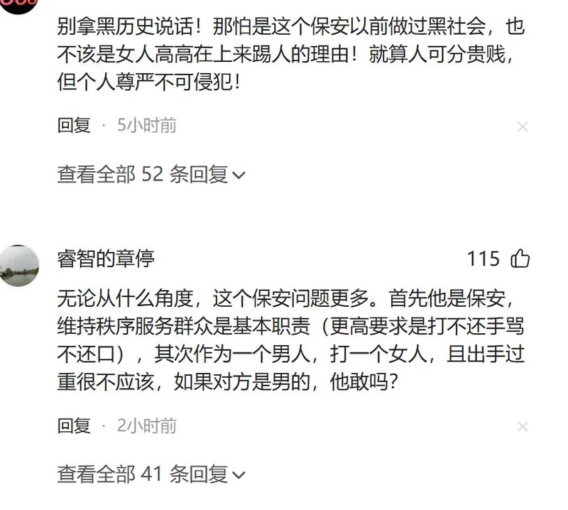 看得出来,这个保安不是第一次这么嚣张,这次扇耳光,也不是一时冲动,而是长期耍横惯了,把自己的工作职责,当成了耍威风、欺负人的资本。