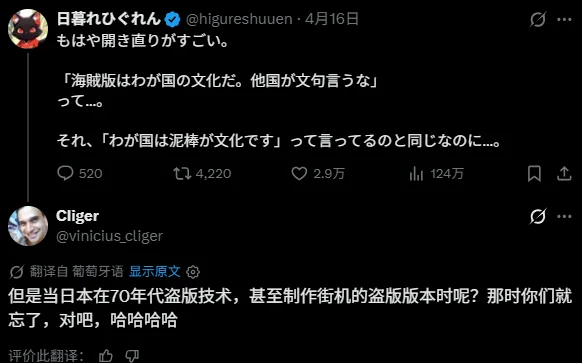 “简直是破罐子破摔到极致了,”有日本用户继续阴阳怪气,“这简直就是在说,‘盗版是我们国家文化的一部分,别国别来抱怨’。”