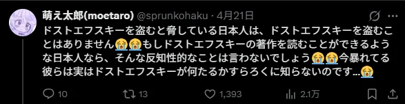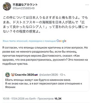 “我同意日本人在这件事上太过苛刻了,”他用那种熟悉的“道德高地”语气发问,“如果日本人去读盗版的陀思妥耶夫斯基,还夸赞作品传播广泛,俄罗斯人不会讨厌吗?”。