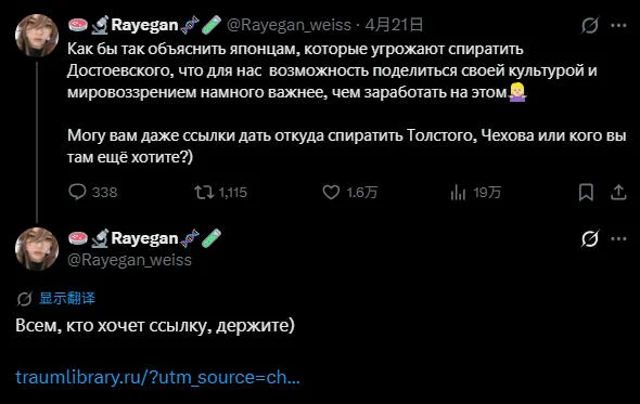 21日,俄罗斯用户@Rayegan_weiss站出来,语气轻松又大方:“怎么跟日本人解释呢?对我们来说,把自己的文化和世界观分享出去,比靠这个赚钱重要得多。我甚至可以给你们链接,让你们去‘盗版’托尔斯泰、契诃夫,或者你们还想看谁的?”