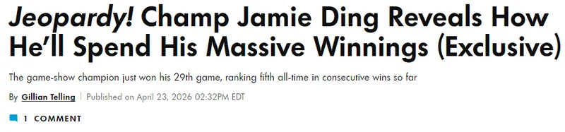 这一次站在聚光灯下的还是Jamie Ding。在最新一集播出的 Jeopardy! 节目中,他再次轻松拿下一场胜利,把自己的连胜场次刷新到了第29场,同时也把个人累计奖金推高到了793,602美元;单场比赛中,他又收入19,001美元,这样的节奏,已经不再是“赢一场比赛”,而更像是在稳定地拉开差距。