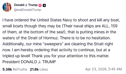 美国总统特朗普周四进一步升级措辞,下令美国海军“击沉任何在海峡布设水雷的船只”,并强调“不得有任何犹豫”。