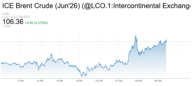 在这一背景下,油价盘中明显走高。布伦特原油期货最终收于105美元/桶上方。